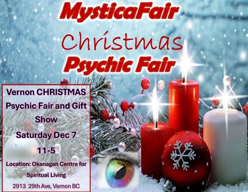 <p>Meet-up with Local readers and mystics at our Christmas Psychic Fair and Gift Show! <br />MysticaFair is the place to meet with some of the Okanagan’s finest readers of all varieties! Bring a friend and spend the day being inspired, gain advice, clarity and awakening. <br />Shop in our Bookstore for a wonderful variety of mystical gifts and books – just in time for Christmas! <br />Saturday Dec. 7th from 11-5 at the Essence Bookstore and Teahouse – otherwise known as the Okanagan Centre for Spiritual Living. 2913 29th Ave, Vernon. <br />Admission is $5 cash please at the door. (goes towards our non-profit hosts – the Okanagan Centre for Spiritual Living )</p>