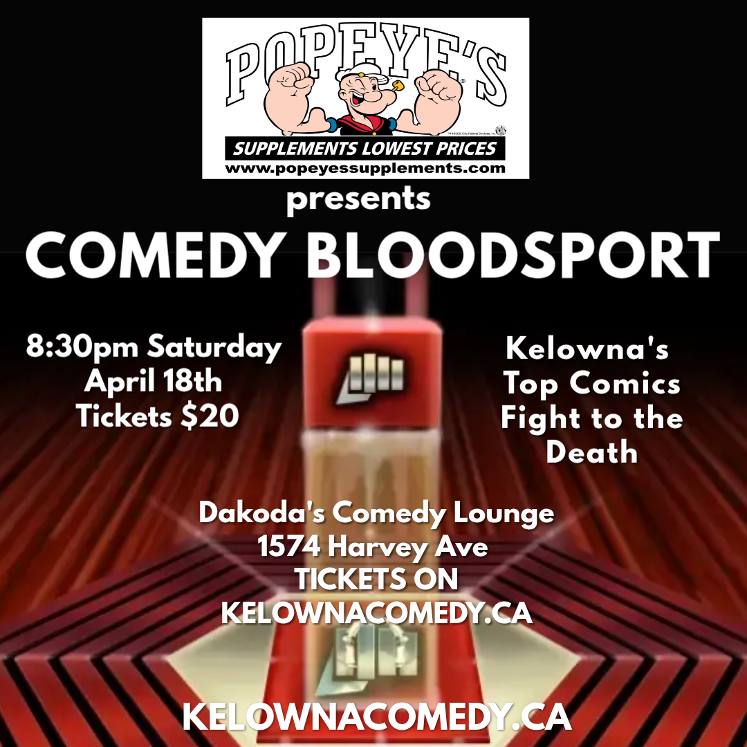 Get ready for the Comedy Bloodsport, brought to you by Popeye’s Supplements! This legendary comedy tournament is set to shake up Kelowna’s comedy scene like never before. We’re pitting the seasoned veterans against the rising stars in a battle of wit and humor that’ll leave you in stitches!Our brave comedians will bring their A-game, armed with their best material, but only one will emerge victorious. The audience holds the power to crown the champion, who’ll walk away with cold hard cash and the glory of being the funniest in town!We couldn’t have done it without our fantastic sponsors, Popeye’s Supplements. They’ve got our back and make this show possible. Let’s show them some love and support! It’s going to be a night of laughs, tears, and side-splitting comedy madness that you won’t want to miss. See you there!