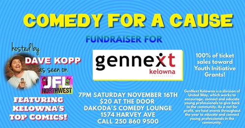 We are excited to present Comedy for a Cause for GenNext Kelowna! Come out for a huge night of laughs featuring Kelowna’s top comics and hosted by Dave Kopp, as seen on Just For Laughs Northwest! There will be eight different comedians on the show and 100% of ticket sales will go toward the cause! GenNext Kelowna is a division of United Way, which works to encourage, connect and educate young professionals to give back to the community. As a not for profit we host events throughout the year to educate and connect young professionals in the community.Every year, GenNext Kelowna hosts events both large and small in order to raise funds for Youth Initiative Grants within the Okanagan. Our mandate is to give $5,000 annually for these grants, of which all is raised through these events. These funds are dispersed to entrepreneurial youth who have created programs to improve and support their community.