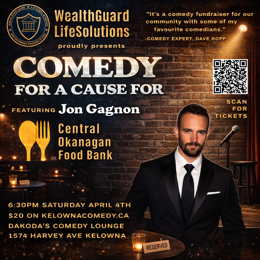 Get ready for a huge night of laughs for a great cause!Comedy for a Cause for the Central Okanagan Food Bank is made possible by the generous sponsorship of WealthGuard LifeSolutions.Headlining the night is Jon Gagnon — a Vancouver-based stand-up whose razor-sharp storytelling, lightning-quick improvisation, and laid-back swagger make every set feel brand new. He blends clever observations with spontaneous crowd work that evolves in real time, so no two shows are ever the same.A two-time finalist in the Vancouver Yuk Yuk’s Comedy Competition, Jon has crushed stages at the Burbank Comedy Festival, New York Comedy Festival, and Paris Comedy Festival. He’s also an award-winning filmmaker and screenwriter, the creator of the animated series Stickman Cartoon, and the star of the late-night show This Month Tonight. He even flexed the same lightning-fast brain on Season 2 of Canada’s Smartest Person.A regular at Underground Comedy Club (two-time winner of Best Comedy Club in Vancouver), Jon delivers high-energy performances that mix polished material with off-the-cuff gold, keeping audiences guessing, laughing, and coming back for more.Whether he’s in a club, a theatre, or on an international stage, Jon’s unique cocktail of storytelling, improvisation, and razor wit makes every performance feel personal, unpredictable, and impossible to forget.This event is proudly presented by WealthGuard LifeSolutions — helping you fire your bank and build your own family banking system now that the old rules no longer apply.Enjoy the laughs on us.