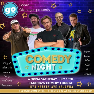 Get ready for a night of non-stop laughter with “Gonzo Okanagan presents Comedy Night”! Join us as we showcase five of Kelowna Comedy’s freshest faces, bringing you their unique and side-splitting humor. Featuring the comedic talents of Logan Bligh, Alex Kovacs, Jordan Blaskovitz, Lucas Vautour, and Riley Hindley, this unforgettable evening promises to leave you in stitches. Best of all, 100% of ticket sales support the Gonzo Okanagan Fundraising Association, dedicated to nurturing local artists right here in Kelowna. Don’t miss this chance to enjoy a hilarious night out while making a difference in our vibrant arts community. Special thanks to our generous sponsor for making this event possible! Grab your tickets now and join the fun!