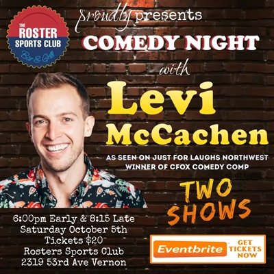 Join us for an evening headlined by the incredibly talented Levi McCachen at The Roster in Vernon! Levi’s comedic brilliance has been showcased at Just For Laughs NorthWest, the Pemberton Music Festival, and as the winner of the CFOX Comedy Competition. His sharp wit and unique perspective on the chaos of modern dating, the quirks of generational divides, and everything in between promise to have you laughing all night long.