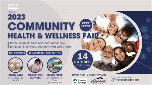 Join us at the Community Health & Wellness Fair 2023!Showcasing over 40 local vendors from the health and wellness community! Come connect, shop and learn about new products & services, you may even WIN a prize!FREE Admission, Door Prizes & Giveaways!- The first 100 guests will receive a goody bag full of products, coupons and special offers!- The first 500 guests will receive a bonus entry into the Grand Prize Draw – A SPA GETAWAY FOR TWO at the beautiful Sparkling Hill Resort!- EVERYONE can enter to WIN many PRIZES!!We have a wide variety of AMAZING VENDORS including…- Holistic Health Practitioners- Massage Therapists- Naturopaths- Chiropractors- Personal Trainers- Hypnotherapists- Yoga Teachers- Nutrition Specialists- Weight Loss Coaches- Personal & Home Care Service Providers- Natural & Organic Foods & Products- Health & Home Products- Non-Profit Organizations- Community Resources & Services- And more!Many vendors are generously offering giveaways, prizes, workshops, demonstrations, free onsite services and so much more during the fair!Check out our vendor list and more details here – https://www.risecoachingbc.com/communityfairThank you to our SPONSORS – Interior Savings & Sparkling Hill Resort!We appreciate your support in helping make the Community Health & Wellness Fair a success for all!Contact us with any questions at info@risecoachingbc.com