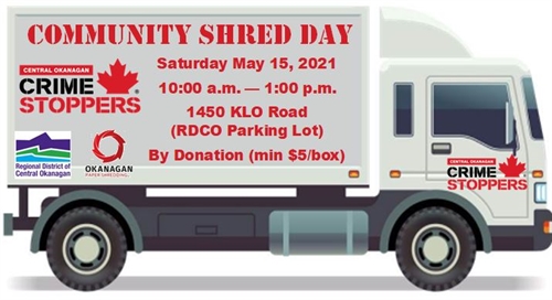 Ready, set, SHRED! Okanagan Paper Shredding will be at the Regional District of Central Okanagan parking lot at 1450 KLO Road on Saturday May 15, 2021 at 10:00 a.m. until 1:00 p.m. Safely dispose of your sensitive documents by donation. All proceeds to Central Okanagan Crime Stoppers.COVID 19 protocols will be adhered to.