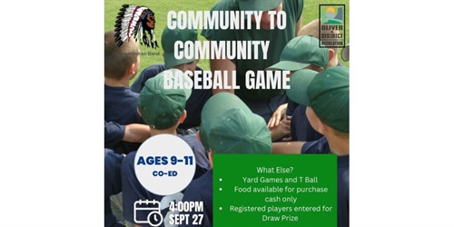 <p>Oliver Parks and Recreation is hosting a community baseball game for youth ages 9-12 from the Osoyoos Indian Band and the Town of Oliver + Area C. This is a recreational game with a focus on building community. Registration is free. Spectators are encouraged to come watch, mingle, and cheer on the players. Looking to keep the rest of your party entertained? Lawn games and Tee Ball will be set up on Diamond 1. Supper provided to the players. Spectators may purchase food while supplies last (cash only). Registering a player? Your family name will be entered in a draw (must be present to win).</p>