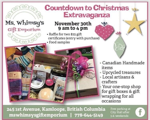 Join us for MsWhimsy’s Countdown to Christmas Extravaganza! Enjoy yummy food & drink samples, and choose from a range of Canadian handmade and up-cycled treasures, get a head start on your Christmas gift shopping – complete with gift boxes and gift wrap – your one stop shopWith every purchase you will be entered to a draw to win one of two gift certificates! We can’t wait to see you there