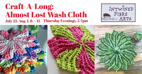 We are hosting a Craft-A-Long. Pick Knitting or Crochet and work along with the group as we create our own Almost Lost Wash Cloths Thursday Evenings: July 25, August 1, 8, + 15Saturday Mornings: August 3 + 10$2 daily drop-in fee OR Drop-In MembershipWe will be working with the Almost Lost Wash Cloth pattern by Julie Tarsha, the Mini Almost There Wash Cloth by Sandy Tieman or the Circle Point Wash Cloth by Glamour4You ( a crocheted version of the Almost Lost pattern) Check out the pattern details via the Ravelry link bellow. Be sure to bring appropriate needles, hooks and/or yarn with you. Materials wil alsol be available for purchase at Intwined Fibre Arts, Althea can help get you set up. Worsted Weight Cotton6mm hook or 5mm needleshttps://www.ravelry.com/patterns/search#query=almost%20lost&sort=recently-popular&view=captioned_thumbs&page=1