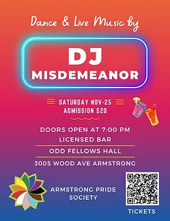 <p>Come celebrate at Armstrong Pride’s November Dance with DJ Misdemeanor! <br />Licensed Bar</p>