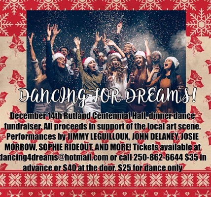 Do to events beyond our control DANCING FOR DREAMS has been POSTPONED to a date that is TBD, we would like to thank anyone and everyone for their support and we hope you will stick by us for a future event! We will be contacting all those with pre purchased tickets and offering a full refund or two tickets to the rescheduled event! Again we would like to thank you all for your support and we hope you will stick with us as THE SHOW MUST GO ON! Come get your dance on and support your local arts community, Dancing For Dreams is the first annual dinner dance fundraiser in support of local artists current and future in Kelowna. Join us for a night of live music, dinner, dancing, special guest performances, silent auction and more! Performances from JIMMY LEGUILLOUX, JOHN DELANEY, JOSIE MORROW, SOPHIE RIDEOUT AND MORE! Also featuring special performances from FEMME FETAL and local actors GRAHAM DALEY and BLAKE WILKINS! This will be a night you do not want to miss! Tickets are $35 in advance or $40 at the door or $25 for dance only! Tickets are available by emailing dancing4dreams@hotmail.com or call 250-862-6644 to reserve your tickets now! Tickets are already selling fast! So get yours now. Big thank you to our two main sponsors WENTWORTH MUSIC and NEW VINTAGE THEATRE SOCIETY