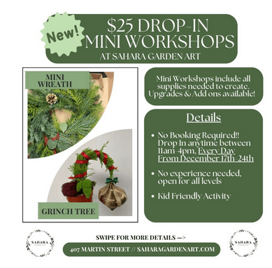 <p>We are offering drop in mini workshops for all ages & experience levels. Kid friendly options. <br />You decide what to create: Grinch Tree, Mini Wreath or Air Plant terrarium. (While Supplies Last) <br />11am-4pm drop in to the store and choose from our 3 mini workshop options: Grinch Tree, Mini Wreath OR Air Plant Terrarium <br />What makes the mini workshops different from our regular workshops? Mini workshops will still include everything you need create ie: plant, planting supplies & select toppings! Nothing more, nothing less. You are still welcome to select a vessel or extra plants from the store to create with for an additional cost. <br />Mini Workshops are kid friendly!! The grinch tree and air plant terrarium can be as easy or complicated as you want to make it! With easy care afterwards both options are a great intro to plants for the littles.</p>