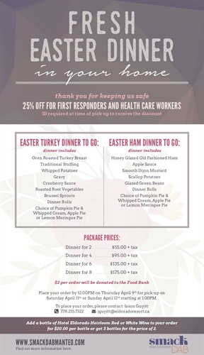 Enjoy a hassle-free Gourmet Easter Dinner To-Go with your family in the comfort of your own home prepared by our Executive Chef at Smack DAB. Choose between our Traditional Turkey Dinner and our Delectable Ham Dinner with all the fixings, complete with dessert too!To view our Easter To-Go Menu, please visit: http://ow.ly/Xq0850z8gVTAs an expression of our gratitude to all First Responders and Health Care Workers for keeping us safe, we would like to offer you 25% Off our menu prices. For our community, we will be donating $2 from each order to the local Food Bank.Place your order by 12:00PM on Thursday April 9th for pick-up on Saturday April 11th or Sunday April 12th starting at 1PM.To place your order, please contact: Jason Guyitt at 778.215.7322 or e-mail jguyitt@eldoradoresort.ca