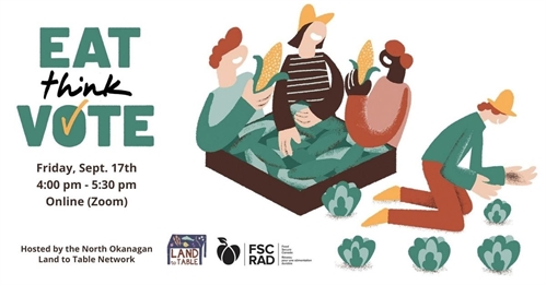 Join the North Okanagan Land to Table Network and the five federal candidates from the North Okanagan-Shuswap riding for an online food forum!Everyone is welcome to come hear from our candidates, ask questions, and become more informed about their positions on food sovereignty, along with other food topics such as food insecurity, resilient local food systems, decent work & justice for food workers, and more.