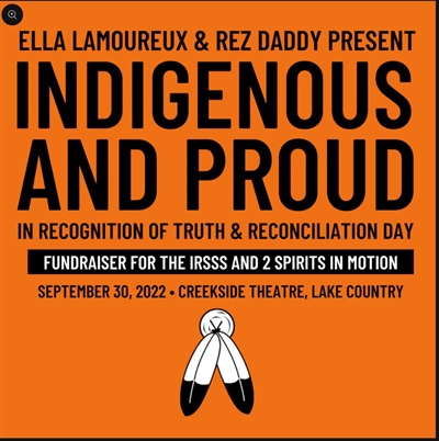 <p>n honour of Truth and Reconciliation day, Ella Lamoureux and Rez Daddy have created a special one-time show, with proceeds going to two charities that are near and dear to their hearts. Taking place at the Creekside Theater in Lake Country on September 30th, this won’t be your regular drag show. While it’ll still be a lot of fun, expect some honest conversations, a diverse cast and some indigenous education while the show takes place.<br />“Doing this fundraiser with Rez Daddy is important to me as it helps to continue to bring awareness to indigenous causes. Showcasing indigenous artists is a great way to bring people together! I’m really looking forward to this event” says Ella Lamoureux.<br />Each year, September 30 marks the National Day for Truth and Reconciliation. The day honors the children who never returned home and survivors of residential schools, as well as their families and communities. Public commemoration of the tragic and painful history and ongoing impacts of residential schools is a vital component of the reconciliation process.<br />All proceeds from the event will be split and donated to both the IRSSS and 2 Spirits in Motion charities. Rebellious Unicorns are pleased to be supporting the curation of this event and are honoured to be able to support indigenous creators.<br />Tickets:<br />https://www.rebelliousunicorns.com/products/ella-rez-present-indigenous-proud?_pos=1&_sid=531895915&_ss=r</p>