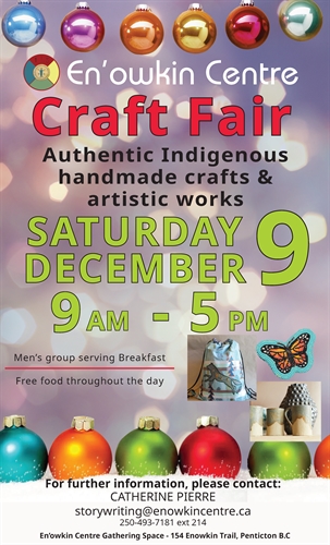 <p>Come down and join us at the En’owkin Christmas Craft Fair featuring authentic and original Indigenous crafts and artistic works from various vendors. <br />Men’s group will be cooking breakfast so bring your appetite and spending money!</p>