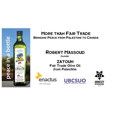Hear firsthand from Robert Massoud, founder of Zatoun, fair trade olive oil from Palestine how Zatoun created a national network of customers and partners with nothing except the promise of a mission to connect people to something that is important to them. Zatoun sells its high quality olive oil to activist and faith-based communities and the fair trade network across North America as a way to touch people and empower global change.UNC 106 – 3333 University Way, Kelowna, BC V1V 1V7, Canada