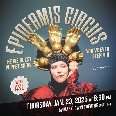 <p>The Weirdest Puppet Show You’ve Ever Seen <br />A spicy puppet cabaret, hosted by a sassy grandma who keeps trying to steal the show. Ingrid Hansen, a puppeteer for Jim Henson Company’s Fraggle Rock, performs this beautifully twisted variety show. Watch behind-the-scenes as Hansen performs a live puppet film, animating cheeky vignettes in the palm of her hand and projecting them onto a huge screen. <br />“Both live and magnified on screen, in cunningly angled cameras and mirrors, we see Hansen create characters from her own hands, fingers, tongue, in a saucy and jostling vaudeville of ‘stars’. NUTTY, INGENIOUS, MESMERIZING.” – 12th Night <br />Costumes by JIMBO (winner of RuPaul’s Drag Race) <br />Rating: 14+ </p>