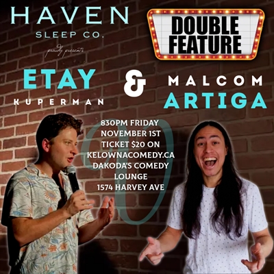<p>Join us on Friday, November 1st, at 8:30 PM for a night of top-tier comedy, presented by Haven Sleep Co at Dakoda’s Comedy Lounge. This exciting show features Etay Kuperman, a touring comedian from Toronto known for his sharp wit and hilarious takes on the chaos of modern life. Etay is a star on the rise. Later this year Etay will feature at the London Sorry Comedy Featival and Keenan presents Pop Up Comedy Fest in Toronto. Sharing the stage is Kelowna’s own, Malcom Artiga, a talented multi-disciplinary artist whose bold humor and unique creative energy will leave you laughing and inspired. Don’t miss out on this one-of-a-kind event with two of Canada’s most exciting performers. Get your tickets now for a night of unforgettable entertainment! Thanks so much to Haven Sleep Co for their generous support of Kelowna Comedy.</p>