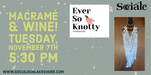 <p>Join Kate with EVER SO KNOTTY for a fun night of knot tying and Wine at Sociale! <br />In this workshop we explore the art of macrame in a soothing setting with a nice glass of wine. We will be creating a cute small wall hanging that you can take home and hang or use as a fabulous handmade gift for the holidays!<br />No experience is necessary.<br />This fabulous class will include one Glass of Wine!Charcuterie, Dolci, Espresso Bar & Wine Bar will be available for purchase!</p>