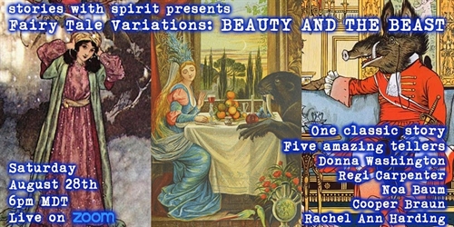 “Beauty, will you marry me . . . ?”Let Stories with Spirit and our dear friends bring you a tale both familiar and strange. Five tellers will bring you five very different versions of Beauty and the Beast. From the fairy tale classic to the literary. From side splittingly funny to the deeply dark these tellings and re-tellings will range up the emotional gamut.Rachel Ann Harding and Cooper Braun are so happy to welcome our dear friends to our sixth in this series of shows. Donna Washington, Noa Baum, and Regi Carpenter are each incredible storytellers. We are overwhelmed to have them come and play with fairy tales with us!This is an Adults Only show. The stories range from humorous to very dark retellings, and we recommend this show to only those over 18 years of age.When you get your ticket (you only need one, regardless of how many people are behind your computer) you will receive a confirmation email with the ZOOM link to the show.The show will take place at 6:00pm MDT (Denver) or 5:00pm PDT (Los Angeles), 7:00pm CDT (Chicago), 8:00pm EDT (New York)This show is a Pay What It’s Worth event based on your experience of the show. When the show is done we ask that you pay what you felt two hours of art was worth. If you feel the need to pay before the show, there will be links to do so in your confirmation email.