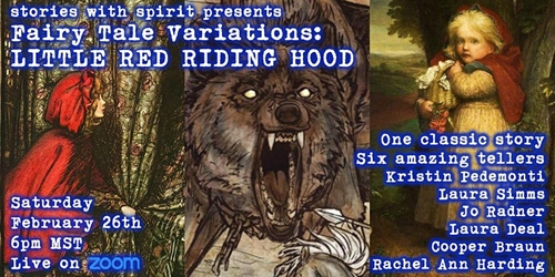Adults only storytelling!”Go straight to Grandma’s and do not step off the path . . . “Let Stories with Spirit and our dear friends bring you a tale both familiar and strange. Six storytellers will perform six very different versions of Little Red Riding Hood. From the fairy tale classic to the modern. Hear the story from every character’s perspective.Next to Cinderella, Little Red Riding Hood is perhaps the most well known folk story in the world. Come with us down the path of pins and the path of needles. Cooper Braun and Rachel Ann Harding are so happy to welcome four new tellers to our virtual stage. Cooper grew up on the stories of Laura Simms , who will bring to light the story of the wolf. Kristin Pedemonti tells tales of awesome female power, and this story is no exception. Jo Radner shows how stories beget stories. And Laura Deal will show you a version of the huntsman you never expected.A Q&A with the tellers will follow the show, and a recording will be sent to all ticket holders.This is an Adults Only show. Some of these stories will be very dark retellings, and we recommend this show to only those over 18 years of age.When you get your ticket (you only need one, regardless of how many people are behind your computer) you will receive a confirmation email with the ZOOM link to the show.The show will take place at 6:00pm MST (Denver) or 5:00pm PST (Los Angeles), 7:00pm CST (Chicago), 8:00pm EST (New York)This show is a Pay What It’s Worth event based on your experience of the show. When the show is done we ask that you pay what you felt two hours of art was worth. If you feel the need to pay before the show, there will be links to do so in your confirmation email.