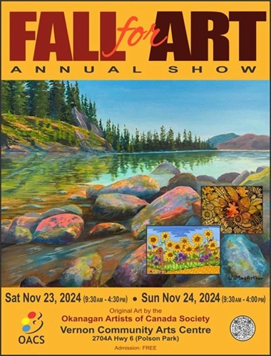 <p>The Okanagan Artists of Canada invite you to our Fall for Art Show Saturday Nov 23 and Sunday Nov 24. <br />The Fall for Art Show and Sale features artwork by 40 artists in a variety of styles and media. <br />In addition to large paintings, there are smaller paintings that are under 100 square inches and priced at $100 or less, and cards created from original artwork. <br />Artists are on location during the event. <br />Fall for Art is held at the Vernon Community Arts Center 2704 Hwy 6 in Polson Park and admission is free. A great way to support local…</p>