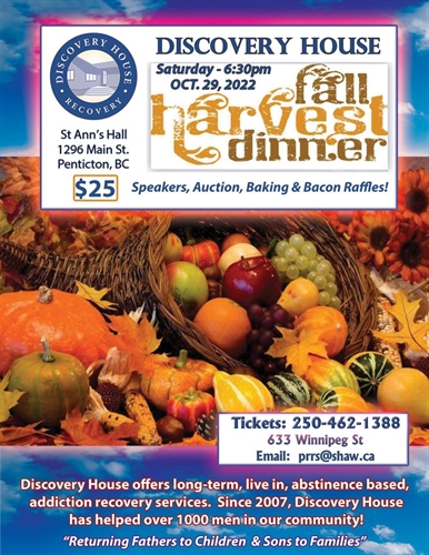 <p>Come support the Discovery House Recovery program by joining us for our Fall Harvest Dinner which will include a Silent Auction, plus our always popular Baking Raffle, this year including BACON!<br />Tickets are only $25 each or sponsor a reserved table of 8 for $200.<br />Event will feature:<br />**Discovery House alumni speakers will share their stories of recovery and how Discovery House has helped them become healthy, vibrant members of their community and families.<br />** Delicious dinner of Smoked Beef Brisket by The Nest Restaurant, Vegetarian Lasagna, Side Dishes, Salads and Desserts by Chef Rob and our Discovery House Cooking group.<br />**Fall Harvest Auction (part 2): if you missed the online auction last month, don’t worry, we’ve still got a bunch of items left to auction off including beautiful art pieces, clothing, 2022 Championship Vees Jersey signed by the entire BCHL Champs, gift certificates, salon packages, and so much more…<br />**Our baking raffle. Bring an item to donate if you will, purchase tickets and you could win many, many delicious desserts, and this year we’re even featuring sides of bacon! That’s right, I said bacon!<br />All proceeds will support subsidizing the cost of treatment for someone who could not otherwise access long-term, live-in, substance free treatment.<br />Call Jerome to arrange tickets, volunteer or donate baking or tickets at: 250-462-1388<br />OR<br />Call our office at 250-490-3076 and stop by to pick up tickets at our office at 633 Winnipeg St. (back door) any day between 9am-9pm.</p>