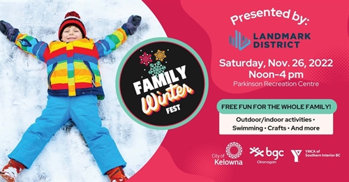 <p>Come to celebrate our first annual Family Winter Fest! This is a FREE community event that will bring together families to participate in interactive and inclusive holiday activities and entertainment.<br />Enjoy a day of fun including:<br />– Free pool from 1 p.m. to 4 p.m.<br />— Free Fitness centre drop-ins<br />– Outdoor + indoor winter games<br />– Activities + prizes<br />– Inflatables + activity stations<br />– Holiday craft fair + community booths<br />– Photos with Santa. Santa arrives at 12:45 p.m. Photos until 3:45.<br />-Food trucks<br />…and more!<br />Presented by the Landmark District in celebration of their 25th anniversary of the Tree of Hope light-up. Held in partnership with the City of Kelowna, YMCA of Southern Interior BC and the BGC Okanagan.</p>
