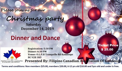 <p>Everyone is invited to this annual event of Filipino Canadian Cultural Christmas Party. Please join us as we celebrate this Christmas season and experience the traditional Filipino food in SALO SALO SA PASKO ( Get together this Christmas ).Come and party with us!</p>
