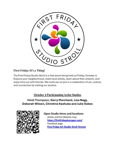 <p>Do you love seeing art in person and meeting the artist? First Friday Art Studio Stroll Vernon invites you to visit artists in their studios to understand their creative processes and experience their art up close. Artists opening their studios on October 4 are: Heidi Thompson, Gerry Marchand, Lisa Nagy, Deborah Wilson, Christine Kashuba and Julie Oakes. This free event is a perfect opportunity to meet the artists and enjoy time out with friends. Follow the link to the map and the artists… https://firstfridayokanagan.com/ This month First Friday is a Culture Days event- https://culturedays.ca/en/events/7f7fd44b-ee5a-4984-8178-ed9336f9fbdd</p>