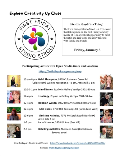 <p>Kick off 2025 by meeting artists in their studios, seeing their work in person and enjoying time out with family and friends.The FIRST FRIDAY ART TRAIL is a free event that takes place on the first Friday of every month. 10 – 8pm HEIDI THOMPSON, 9905 Coldstream Creek Rd (Coldstream)Reception at 6pm and Artist Talk at 7pm10:30 – 1pm MANDI IRMEN, Studio in Gallery Vertigo, 2901 30th Ave12 – 4 pm LISA NAGY, with acrylic demonstration in Gallery Vertigo, 2901 30th Ave12 – 4 pm DEBORAH WILSON, 6002 Bella Vista Rd (Bella Vista)12 – 6 pm CHRISTINE KASHUBA, 7371 McKoryk Rd (North BX) 1 – 4 pm JULIE OAKES, 6700 Old Kamloops Rd (Swan Lk West)2 – 6 pm BOB KINGSMILL, 8405 Aberdeen Rd (Coldstream)</p>