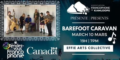 <p>Let’s celebrate the diversity of the Kamloops francophone community during March, le mois de la francophonie.Okanagan-based musical group Barefoot Caravan is coming to Kamloops for a public show on Friday, March 10th at the Effie Arts Collective. They will be joined by Métis dancers Métis Lii Michif Buffalo Gals and other surprises.Tickets :Pre-Sale: $10, please pay by par e-transfer to kam_franco@shaw.ca before 12pm on March 10th.At the Door: $15 Dans le cadre du mois de la francophonie, rejoignez-nous pour célébrer notre merveilleuse communauté francophone et francophile avec une soirée de musique et danse.Venez assister au spectacle de Barefoot Caravan, avec une performance des danseuses Lii Michif Buffalo Gals. Dirigé par la franco-manitobaine Angela Roy, ce groupe musical de l’Okanagan joue de la musique avec des influences rythmiques mondiales qui va vous faire danser.Tarifs :Prévente : 10$ d’ici 12h le 10 mars.À la porte : 15$Veuillez contacter l’Association francophone de Kamloops afin d’obtenir vos billets.</p>