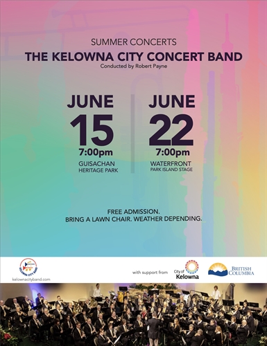 Bring a lawn chair and sit and enjoy the music that our music director and conductor, Robert Payne, has selected for the musicians of the Kelowna City Concert Band. The music will be entertaining and enjoyable, and it is a great way to spend a summer evening (weather permitting).The Kelowna City Concert Band has a long tradition of free open-air concerts, and we are pleased to be back in the parks after a two-year hiatus.
