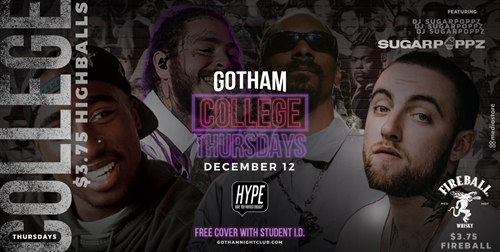 <p>A night dedicated to Hip Hop new and old!College Thursdays at Gotham Nightclub…Presented by Gotham Nightclub, College Thursdays are set to retake the nightlife scene. A repeating weekly, experience the best DJs along side Sugapoppz each week. Free Cover with Student ID before 11pm Guestlist Is also available $3.75 Highballs and $3.75 fireball–Must be 19+ with 2 pieces of I.D.275 Leon AvenueGotham is an evolution of the legendary Level Nightclub</p>