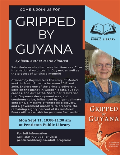 <p>Join Merle Kindred as she discusses her time in Guyana, as well as the process of writing a memoir!Gripped by Guyana: A Memoir of Purpose and Adventure tells the story of Penticton resident Merle Kindred’s work in South America. As a senior, she engaged in two postings with Cuso International in 2017-18—the second deep in Indigenous territories. Ride in her backpack as she assists villagers in reaching their goal of developing ecotourism. Explore one of the prime biodiversity sites on the planet in wooden boats, dugout canoes, and dirt paths. Share her realization that Guyanese development was, and continues to be, influenced by urgent climate concerns, a massive offshore oil discovery, and a government mandate to preserve the remaining eighty percent of its rainforest.In a deeply sensitive account, Gripped by Guyana shares the mechanics and the magic of life in a resource rich country rated as dangerous. When Cuso asked Kindred to file a risk assessment report on life in the interior, she thought about where she hung her hammock in one village: “There’s no problem with locks. There’s no door.”Copies of the book will be available for purchase from the author.</p>