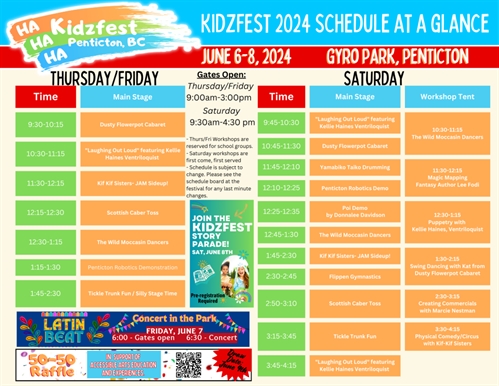 <p>**Schedules are subject to change. Please see schedule posted at Kidzfest for changes. <br />Festival Hours <br />Thursday – <br />9:00am -3:00pm (School Field Trip Day – limited public tickets available) <br />Friday – <br />9:00am – 3:00pm (School Field Trip Day – limited public tickets available) <br />6:30 pm Community Concert in the Park (By Donation – Featuring Lee Edward Fodi and LATIN BEAT) <br />Saturday – <br />8:45 am Kidzfest Story Parade on Okanagan Lake Promenade <br />9:30am – 4:30pm (General Public Day)</p>