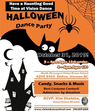 Join us Thursday October 31st for our Spooktacular Halloween Dance Party!Enjoy Halloween snacks & candy, enter the costume contest or just dance your heart out! 3-4pm: Ages 12 & under4-6pm: Ages 13+All ages welcome! Not currently a member of Vision Dance? No Problem! Come out & have some fun!Admission by donation
