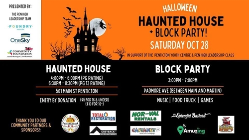<p>The Pen-High Leadership class, Foundry Penticton and the Community Foundation are teaming up for Halloween Haunted House + Block Party on Oct 28th! <br />Join us for a night of eerie excitement and ghoulish delight as we celebration Halloween in style. Come dressed in your most hauntingly creative costumes and prepare for a night of spooky fun! <br />Haunted Hous <br />e – entry by donation ($5 for 16 and under/ $10 for 16+)Proceeds will go towards the Penticton Youth Centre <br />4:00pm – 6:00pm (PG rating) <br />6:30pm – 8:30pm (PG-13 rating) <br />Block Party just outside of the Youth Centre along Padmore Ave <br />3:00pm – 7:00pm <br />Join us for some family fun activities, music and treats!</p>