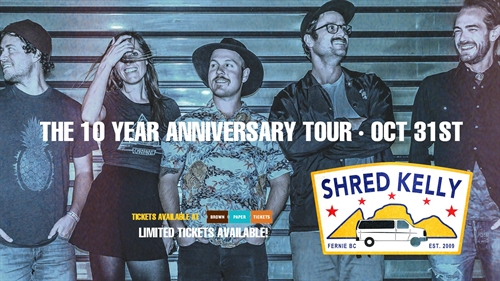 Thursday October 31st SHRED KELLY – 10th Anniversary TourFernandos Pub Kelowna, BCSoaked in electric crescendos and folk tinged sing-along anthems, Shred Kelly is known for their high energy live show that ignites dance floors with their alternative folk sound. Over three albums and countless tours, the five British Columbians have developed their signature sound by taking inspiration from the mountains they hail from and the people who inhabit them. Shred Kelly has seamlessly fused traditional instrumentation with modern rock, presenting a sound that is both unique and compelling.Shred Kelly has produced their most ambitious project yet with their fourth album Archipelago. The collaborative song writing of Tim Newton, Sage McBride, Jordan Vlasschaert, and Ty West have pulled inspiration through individual experiences and musical influences. The result is a dynamic and cohesive collection of dreamy, yet explosively exciting songs dipped in themes of relationships and the world in the modern age. Using traditional instrumentation at the base of the songwriting, the album explodes into a symphony of sounds incorporating banjos, ukuleles, synthesizers, guitar hooks, harmonies and pulsing beats.Their high-energy sound has allowed them to perform at many Canadian and international festivals, such as: NXNE, Reeperbahn, Winnipeg Folk Festival, Breakout West, Riverfest Elora, Ottawa Blues Fest, Shambhala, Evolve, Tall Tree Music Festival, Keloha and Salmon Arm Roots and Blues Festival.The group has also achieved a growing list of awards and recognition; five Kootenay Music Awards, one Western Canadian Music Award, over one million spotify plays, CBC recognition and media attention in Canada, USA, and Germany.On the new album Archipelago (Shred Kellys) energy is captured and this alone is an achievement. This quintet is playing blissfully, sky-high jubilation and enthusiastic folk rock (Rolling Stone Magazine, DE)(Archipelago) is a very relatable album that you will have on repeat for weeks. (CHSR FM)Their shows are joyous celebrations of life that will only reaffirm most of the things you love about music. (Rice and Bread Magazine)