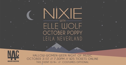 Hallowe’en is here and Nixie is back in Kelowna for one spooky night only! It’s going to be a night full of eclectic and synthy tunes, dancing, and monster mashing with music from Elle Wolf, October Poppy, Leila Neverland, and Nixie. DETAILS:Thursday, October 31st7:30PM (Doors at 7PM)Tickets $25 (1 complimentary drink included with ticket)19+ eventCostumes optional!