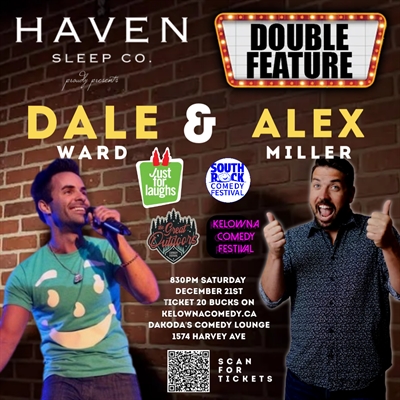 Get ready for a comedy night like no other as Haven Sleep Co. proudly presents Dale Ward and Alex Miller!Dale Ward is a powerhouse of comedy, known for his absurd one-liners, quirky observations, and high-energy performances that keep audiences in stitches. A touring headliner and featured artist on a Just For Laughs live album, Dale’s talents extend beyond comedy—he’s also an actor, a professional artist, and a TikTok sensation with over 215,000 followers and 10 million views on one viral video!Sharing the stage is Kelowna’s very own Alex Miller, a sharp-witted comic with a cheeky sense of humor that pushes boundaries in all the right ways. With performances at Yuk Yuks, Toronto’s Comedy Bar, and the South Rock Comedy Festival, Alex’s hilarious takes on life as a dad and “Kelowna sex symbol” will leave you laughing long after the show ends. A huge thanks to Haven Sleep Co. for supporting live comedy—don’t miss this unforgettable night of laughter!
