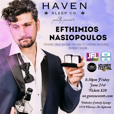 <p>Buckle up for a wild ride of laughter because Dakoda’s Comedy Lounge in Kelowna is gearing up for the ultimate comedy showdown on Friday, June 21st, sponsored by the fantastic folks at Haven Sleep Co! Hold onto your hats as we welcome the one and only Efthimios Nasiopoulos to the spotlight. Hailing from the bustling streets of Toronto, Efthimios is more than just a comedian—he’s a comedic dynamo ready to unleash a tidal wave of hilarity! With a knack for turning life’s everyday absurdities into comedy gold, he’s set to have you rolling in the aisles from start to finish. From sharing the stage with comedy legends like Will Sasso and Bryan Callen to wowing crowds at top-notch festivals such as The Hubcap Comedy Festival and the Winnipeg Comedy Festival, Efthimios is a force to be reckoned with. So, gather your squad, prepare for an evening of belly laughs, and let’s make some memories! Huge thanks to Haven Sleep Co for making this laugh riot possible—see you there!</p>