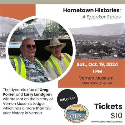 <p>The Vernon Branch of the Okanagan Historical Society and the Museum & Archives of Vernon are excited to present a special installment of their ongoing speaker series, Hometown Histories, delving into the rich history of the North Okanagan. <br />On October 19 at 1:00 PM, join local historians Greg Poirier and Larry Lundgren as they uncover the fascinating past of Vernon’s Miriam Masonic Lodge, #20 on the Grand Registry of B.C. and Yukon. With its iconic building standing proudly on 32nd Avenue for over 90 years, the Freemasons’ presence in Vernon dates back even further, spanning more than 125 years. <br />The event will highlight the Lodge’s long-standing traditions and its significant impact on Vernon’s community. Archives Manager Gwyneth Evans notes, “the Masonic Lodge has an interesting and often underappreciated connection to various groups in our local history, including the early Chinese community in Vernon. Freemasonry’s values of brotherhood and community service mirrored the ways in which these diverse groups contributed to the town’s development.” <br />Larry and Greg will dive deeper into these connections and the wider historical context of Freemasonry, offering attendees a unique glimpse into the legacy of this international fraternity that has quietly shaped much of Vernon’s history. <br />“Greg and Larry have previously been our tour guides for our popular mural tours, and we’re thrilled to have them take on this new role,” says Evans. “They blend factual history with an engaging presentation style that showcases their dynamic and entertaining personalities.”</p>
