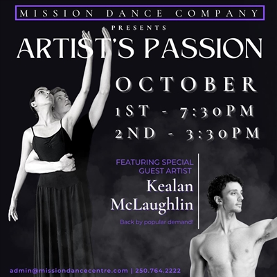 Artist’s Passion is a dance performance featuring accomplished and emerging local dance artistsplus an exhibit of local indigenous artists. We are excited to announce that Kealan McLaughlin,accomplished and internationally renowned principal male dancer, will join Mission Dance Companyagain and back by popular demand. This is a “must see” special performance in which audiences willbe treated to traditional classical ballet, neo-classical and flamenco styles of dance works. Thismixed program of breath taking, exciting, and moving choreography and music will present GIselle,Missa Brevis, Swan Lake excepts, and the premiere of Tanya Vadurova’s flamenco styled ballet called“Layers of Affinity”.