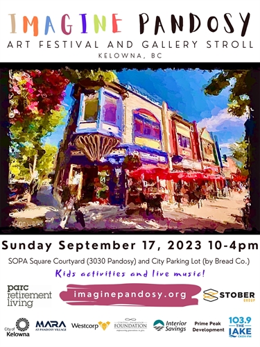 The third annual Imagine Pandosy Art Festival & Gallery Walk will take place on Sunday, September 17, 2023 from 10am til 4pm at SOPA Square, 3030 Pandosy Ave., Kelowna. You will see artists showcasing their art, crafters, displaying their work, live music, lots of children’s activities, food, trucks, and more!https://www.imaginepandosy.org