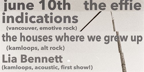 <p>Power-pop/emo band from Vancouver, BC, Indications, invades the Effie with the return of alt rock local heroes The Houses (Where We Grew Up) and a special premiere performance by acoustic artist Lia Bennett.</p>
