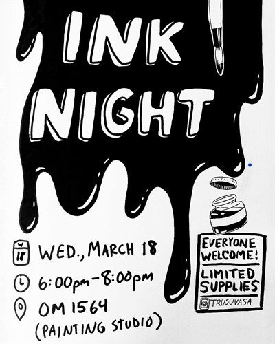 Ink Night is happen Wednesday, March 18th from 6-8pm in the painting studio OM 1564!! Everyone is welcome!!! #truvisualarts #trusuvasa #truvisualarts #visualartsstudent #visualartsstudentassociation #vasa #trusu #trusuclub #mytru #trustudentlife