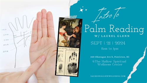 n Intro to Palm Reading, Laurel will go over the major lines of the hands, what the shape of your hand represents and age.Cost: $25Seating: 8 People ???????????? ?????????? ?????????????? & ???????????????? ????????????????????????????Laurel is a self-taught Palm Reader. Beginning her journey when she was 16; when by chance she came across her first palmistry book in ametaphysical shop in Winnipeg. After asking her classmates if I could see their hands, she told them the significance of the lines and the shape of their hands. Word of her readings spread and it wasn’t long before some people stuffed their hands into their pockets or crossed their arms whenever they saw her. Most peoplehowever, found her quite the novelty and wondered how she knew things about them by simply scanning their palms.?????????? h?????? ??????????????????! ???????????????She has been a regular for more than ten years at community and privateevents, metaphysical fairs, Okanagan local summer markets and First Nations Wellness Events and Conferences.To register or for more information please contact Laurel directly by calling ??????-??????-???????? or email her at ??????????????????????@????????.??????.If you would like to know more about Laurel and what she does, check out her Website https://www.laurelglennpalmistry.com/Facebook page Laurel Glenn Wellness