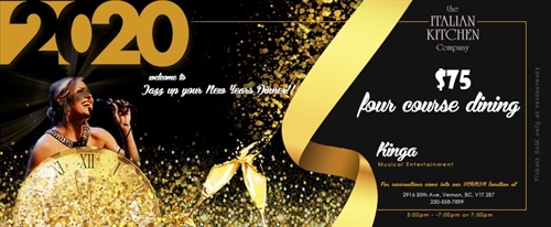 Get your new year’s started of right ! Enjoy evening of food and music at the Italian kitchen company. Chef Rob Dew will prepare for you an amazing Fine Dining Experience accompanied with music by local jazz legend KINGA.Pre New Years Dining at 5:00 pm – 7:00 pm or Join us for our evening sitting at 7.30 pmFor reservations come into our VERNON location at2916 30th Ave, Vernon, BC V1T 2B7or call us (250) 558-7899Gourmet four course dining only at $75 per person