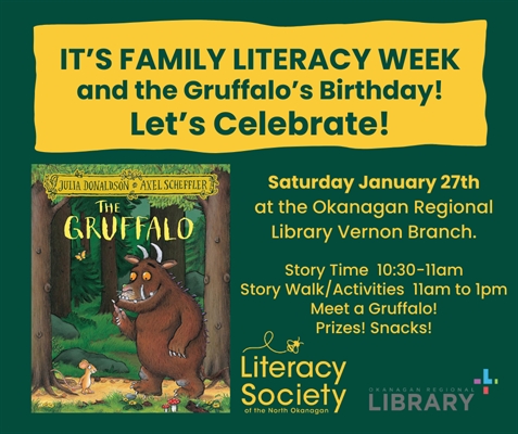 It’s Family Literacy Week!Join the Literacy Society of the North Okanagan and the ORL for a Family Literacy Day 25-year celebration and celebrate 25 years of the Gruffalo! Saturday January 27th at the Okanagan Regional Library Vernon Branch. 11am to 1pm.Do the Story Walk. Meet a Gruffalo! Prizes! Snacks!