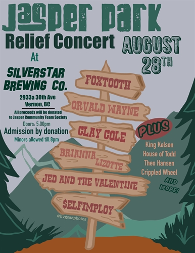 <p>Jasper Wildfire Relief Concert (Ft. Foxtooth, Clay Cole, Orvald Wayne, Brianna Lizotte & More)Join us on August 28th for an unforgettable evening of music and community support at the Silverstar Brewing Co., featuring a spectacular lineup including Foxtooth, Clay Cole, Orvald Wayne, Brianna Lizotte, and more! This special event aids the wildfire recovery efforts for Jasper, Alberta.Event Date: Wednesday, August 28th, 2024 Event time: 5 PM to 1 AM.Location: Silverstar Brewing Co. 2933 a 30th Ave, Vernon, BCTicket Options:General Admission by Donation at the Door: Access to the concert with one raffle ticket included.$35 Premium Package: Includes admission, choice of one beer on tap, a burger, fries or salad, and one raffle ticket.All proceeds will directly benefit The Jasper Community Society in partnership with The Banff Canmore Foundation to support those affected by the wildfire.For more information, visit our Facebook page https://www.facebook.com/events/462537679991748.</p>